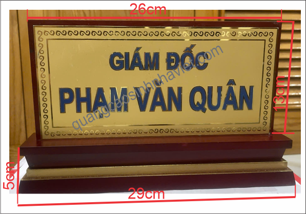 Bảng chức danh hay còn gọi là Biển tên để bàn cao cấp được thiết kế sang trọng với phần đế gỗ chắc chắn, mặt inox sáng bóng, ăn mòn hoặc in khắc chữ rõ nét. Kích thước tiêu chuẩn 26 x 13 cm, đế 29 x 5 cm, phù hợp đặt trên bàn giám đốc, trưởng phòng hay văn phòng công ty. Sản phẩm giúp khẳng định sự chuyên nghiệp và uy tín cho đơn vị sử dụng.