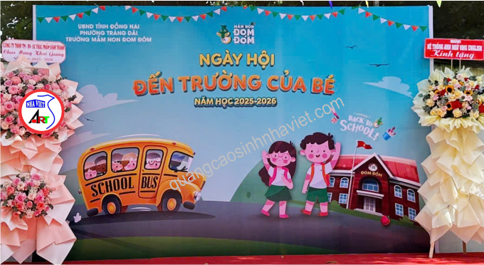 Backdrop sự kiện hoàn thiện tại Trường Mầm Non Đom Đóm, Trảng Dài – Biên Hòa, Đồng Nai (ảnh thực tế thi công)